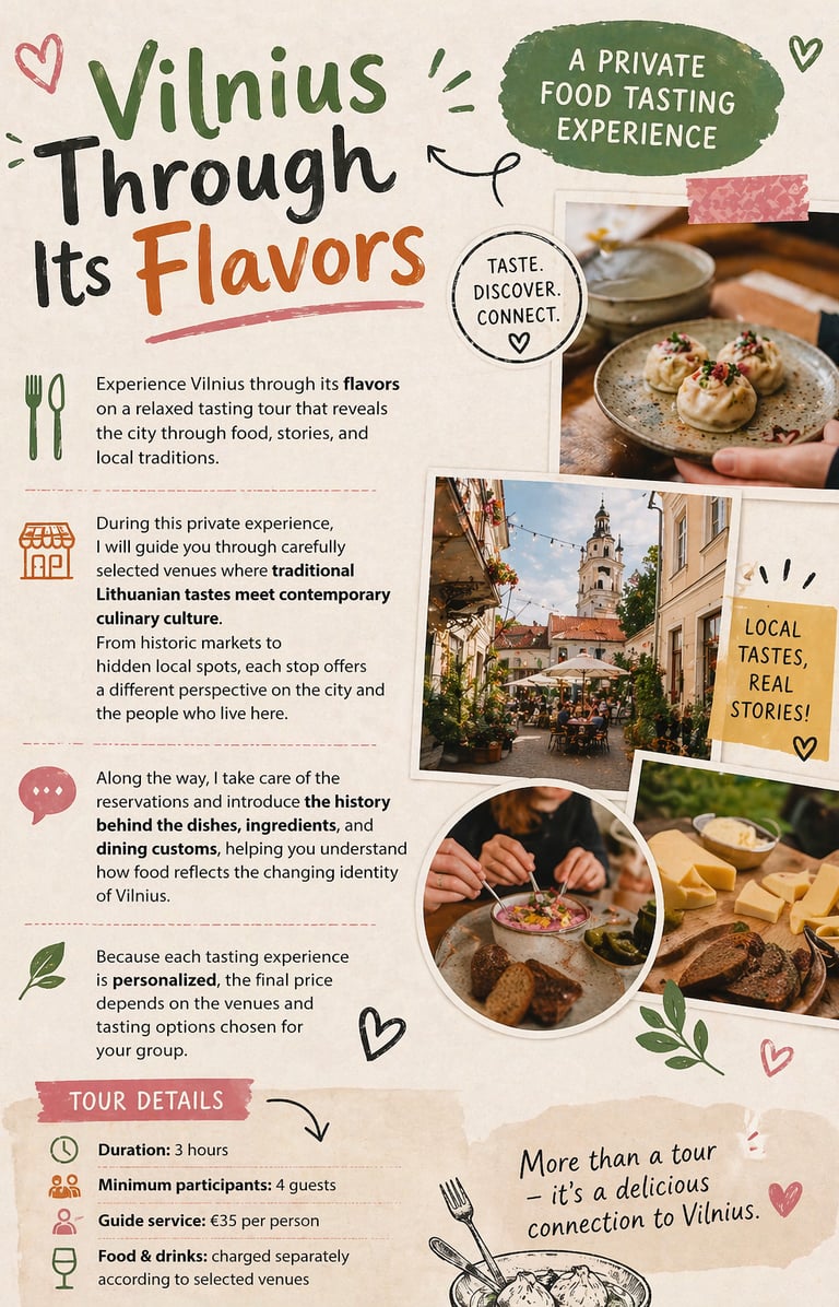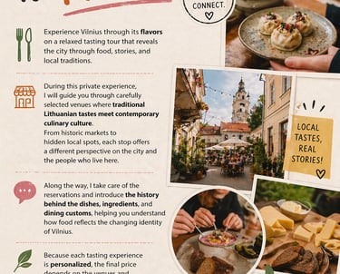 Along the way, I take care of the reservations and introduce the history behind the dishes, ingredients, and dining customs, helping you understand how food reflects the changing identity of Vilnius.